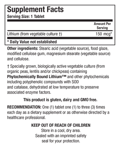 Lithium - Brain Calm & Protect supplies the trace mineral lithium as a whole food, phytochemically bound vegetable culture source. It may be used where a higher concentration of lithium is indicated. Typical dietary intakes of lithium range from 200 to 600 mcg per day, however certain population groups consume levels that are significantly higher. While not considered an essential trace mineral, animal studies have documented detrimental effects of lithium deficiency. Each tablet supplies 150 mcg of plant sourced lithium.